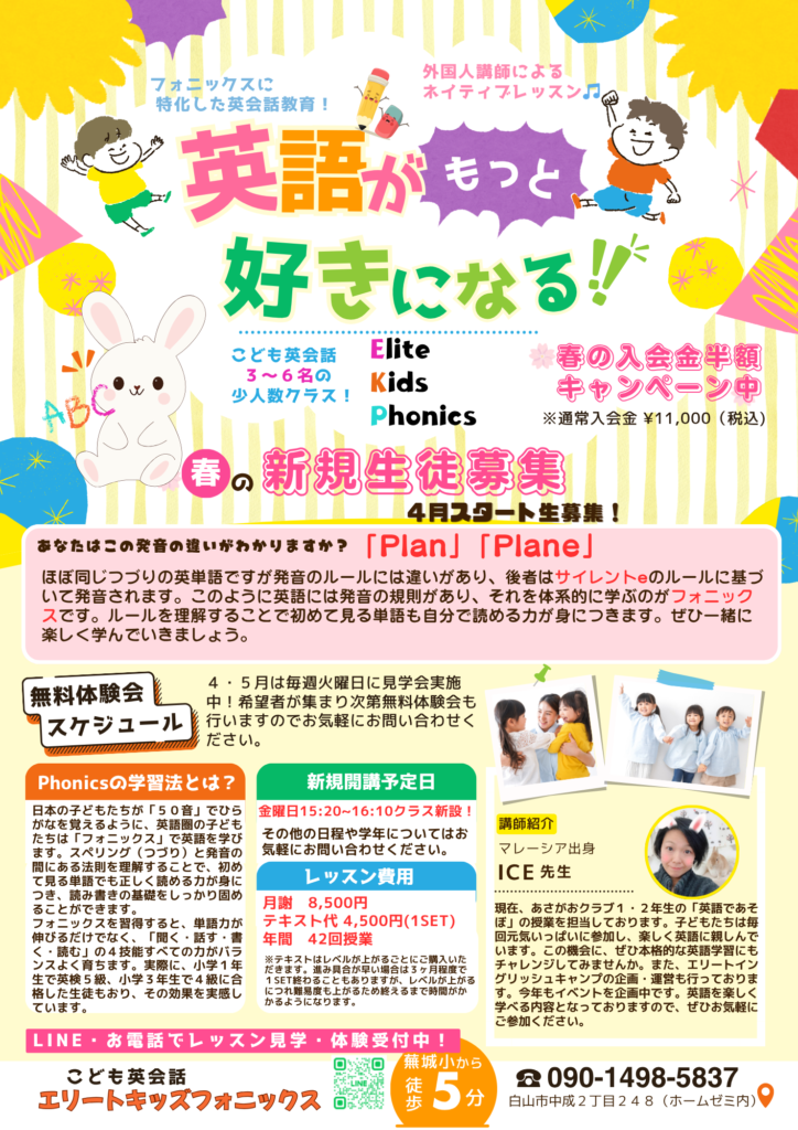 対象学年としては小学2〜6年生から英会話を始める方にぴったりだと思います。英語の発音を覚えることで読み・書き・話すの能力が飛躍的に上昇します。この春みなさん一緒に始めましょう!